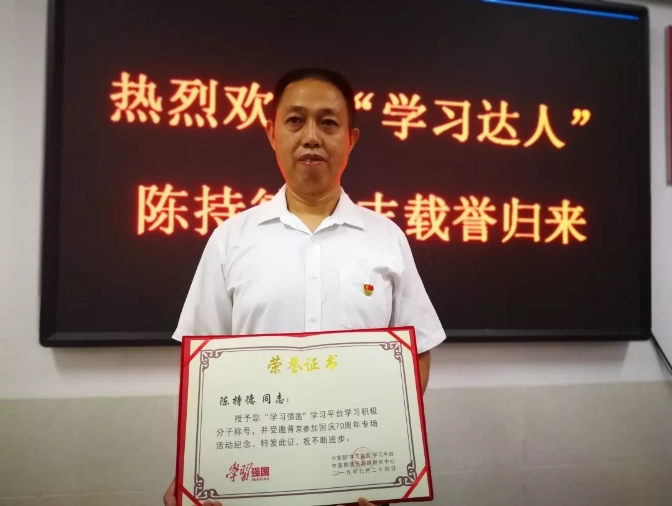 陈持德于2015年至2019年连续被城关镇评为优秀共产党员,2018年被该镇评为优秀退役军人。作为“学习强国”学习积极分子,他总盯着工作之余的间隙学习,并带动和影响亲人和周围同事一起学习,他渴望了解国家正在发生的事情,接受新的思想和理论。“学习强国”平台上习近平总书记的重要讲话、脱贫攻坚等内容是他最关心的。在他的带动影响下,爱人方荃也沉浸于“学习强国”上的知识,积分也达到了10000分以上。夫妻俩占据着“学习强国”书院社区学习组织的前两名。