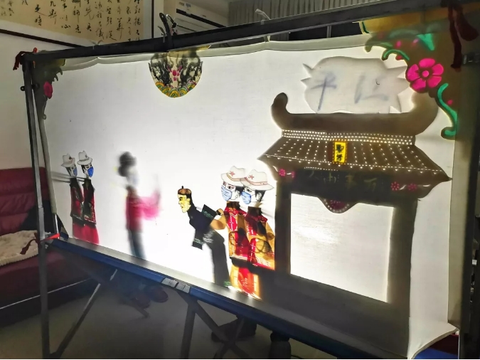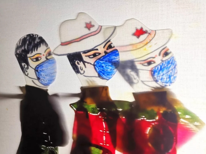于是,钟志远立马行动起来,给影子画上口罩、画上白色的护士帽。一个人,自编自导自演,唱起了防疫版影子戏。