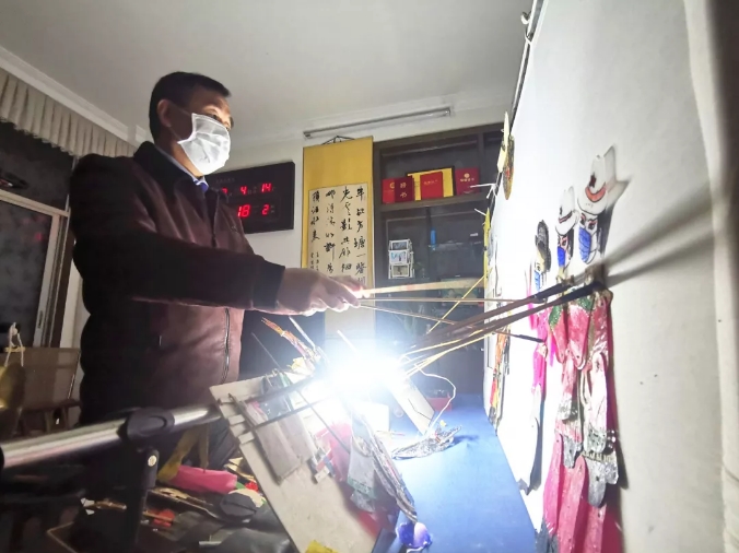 唱皮影戏多年的钟志远,不仅会敲锣打鼓、唱皮影戏,而且还会做影子。看着面前堆得满满的影子,他突然想到,自己可以通过皮影戏来做宣传,让更多人了解防疫知识。