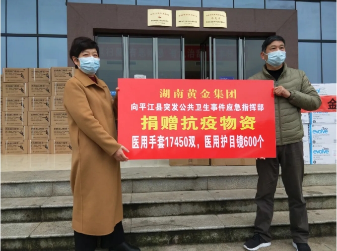 3月9日14时30分,湖南黄金集团党委委员、股份公司总经理陈建权,黄金洞矿业党委副书记、总经理王平海一行冒雨驱车来到平江县,向平江捐赠医用手套17450双、医用护目镜600个,总价值近9万元,为平江县新冠肺炎疫情防控工作助力。县委常委、统战部长张满兰现场接收了物资,并代表县委县政府对湖南黄金集团表示感谢。