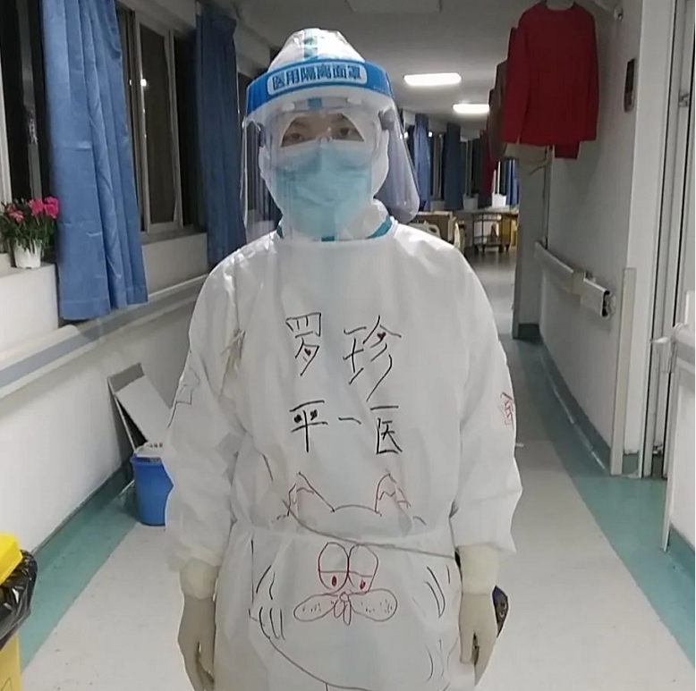 秦女士的想法是:雪白的防护服太空洞了,应该有点什么来点缀。于是,在秦女士手上,一红一黑的记号笔,飞快勾勒出了线条。“你们是黑猫警长,病毒是老鼠,你们就是大家的吉祥物呢。”秦女士的俏皮话,逗笑了罗珍她们。