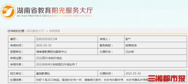 近日,有家长通过湖南省教育阳光服务大厅网络平台,向省教育厅咨询长沙四大名校是否签约外地生的情况。其得到的答复是:自2021年起,取消长沙市一中、湖南师大附中、长沙市长郡中学、长沙市雅礼中学面向全省招生的资格。记者16日从长沙市教育局获悉,消息属实。另外,长沙市今年的中招方案将于近日出台,届时会向社会公布。