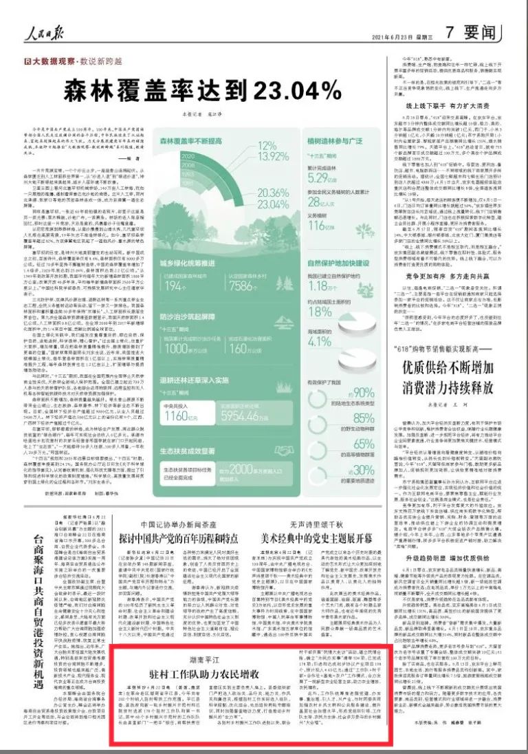 6月23日,《人民日报》纸媒以《湖南平江 驻村工作队助力农民增收》为题,在要闻版刊发文章,报道我县驻村乡村振兴工作队的工作。以下为报道原文。