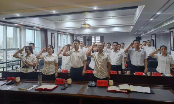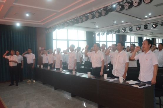 全体党员干部面向党旗庄严宣誓,重温入党誓词。