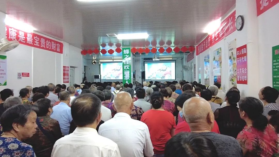 早上7点不到,记者看到一家名为 “蜂之佳”的店铺门口围满了人,进入店铺内,空气污浊,异味扑鼻。100平方米左右的铺面内,挤满了近200人,大家都在聚精会神地听着投影仪里正在播放的健康讲座,一名疑似讲师的人员手持话筒,一边解说,一边与观众互动,现场全是中老年人,无一人佩戴口罩。