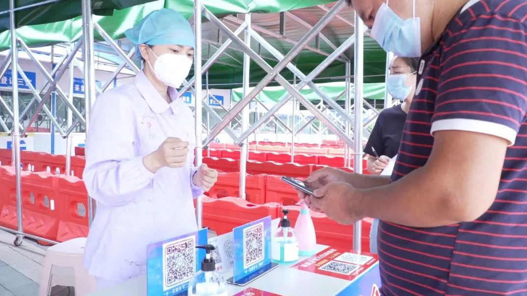 在现场,记者可以看到现场来做核酸检测的人并不拥挤。居民进入天岳广场核酸采集点首先要出示健康码和行程码,随后在工作人员指引下,扫描身份证进入登记区登记电话等个人信息,领取专属的核酸检测号。登记完成后,再来到核酸检测区,医务人员会再次核实个人登记信息与所交条形码是否一致,并将条码贴附于试管。