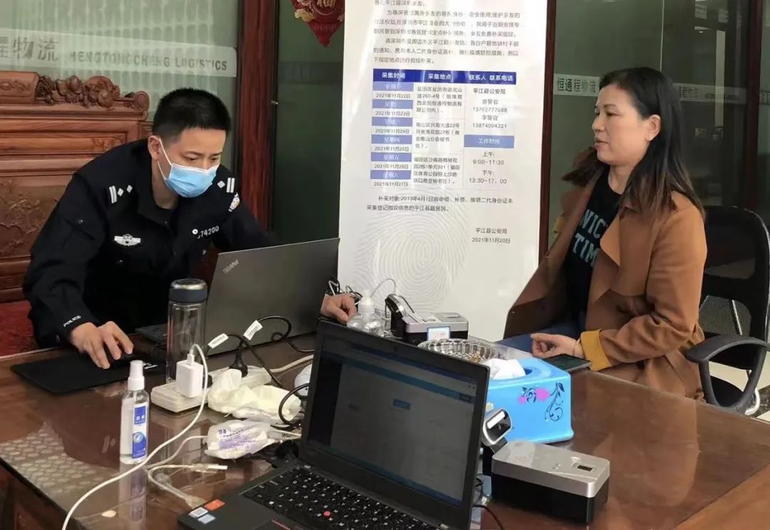 “平江是一个外出务工人员大县,在深圳的群体也很大,为方便群众补采指纹,在局领导的安排部署和深圳市平江商会的大力协助下,我们在平江人较为集中的三个区,分时段设点,为乡友提供免费指纹补录服务。”县公安局人口与出入境管理大队民警介绍。“已经补采两天了,来之前将通知发到了各镇村、社区,明天会去月亮湾的补采点,估计人会比较多,建议有需求的乡友做好防疫措施,早点来。”24日到27日,补采民警将陆续前往深圳南山、福田的补采点,继续为乡友提供免费补采服务。