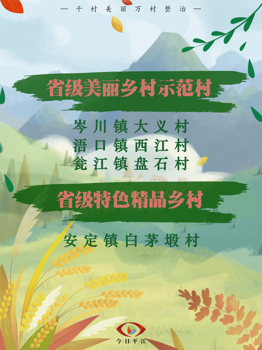 近日,湖南省农业农村厅公布了2021年省级美丽乡村示范村和特色精品乡村荣誉称号获得者名单,我县共4个村入选。其中,岑川镇大义村、浯口镇西江村、瓮江镇盘石村获评省级美丽乡村示范村。安定镇白茅塅村获评省级特色精品乡村。