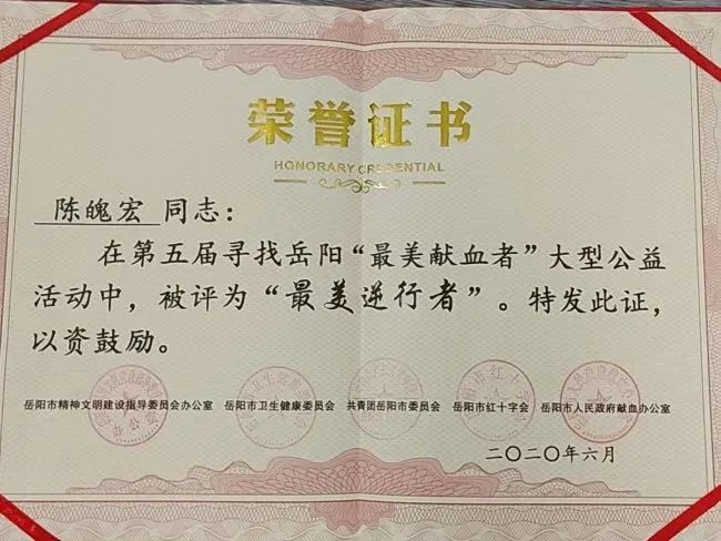 平江的陈魄宏,他的血型是稀有血型,为俗称的“熊猫血”。他24年持之以恒无偿献血10000毫升。