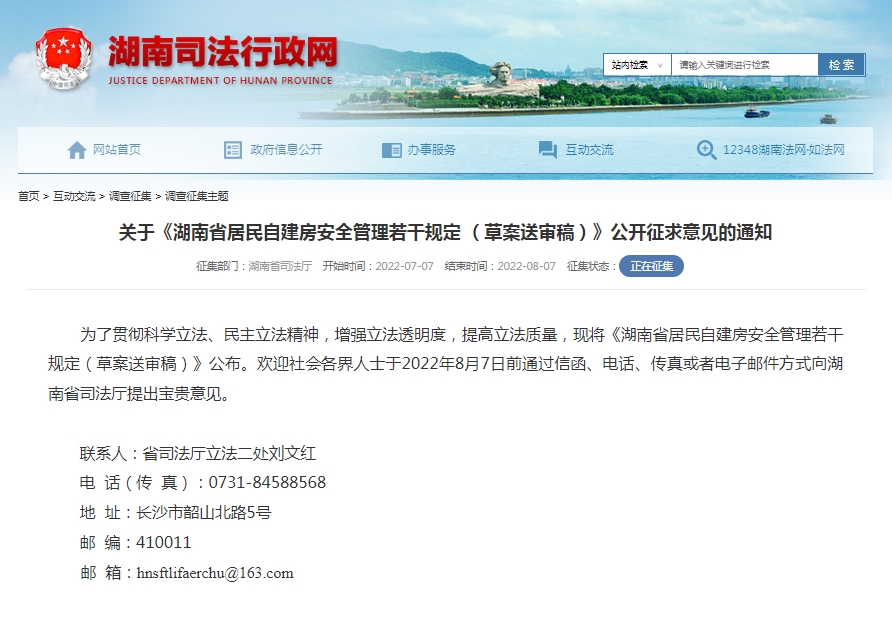 省司法厅网站近日发布通知,《湖南省居民自建房安全管理若干规定(草案送审稿)》(以下简称“草案送审稿”)公开征求意见。社会各界人士可于2022年8月7日前通过信函、电话、传真或者电子邮件方式向湖南省司法厅提出意见。