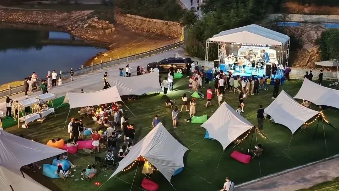 还没走进连云山大峡谷野奢营地,就听到乐曲声、欢笑声从里面传出。在营地中心草坪,数十顶白色大天幕下,游客有的吃着烧烤、有的玩着游戏,长桌上放着当季水果和各色零食,折叠椅边是造型各异的驱蚊灯。不远处,孩子们在绿地上一路疯跑,累了就瞄准一旁的充气沙发,然后肆无忌惮地躺上去,映入眼帘的是蓝天白云,呼吸的是夏日空气。耳边传来的不仅是蝉鸣蛙叫,还有露营音乐节的音乐。