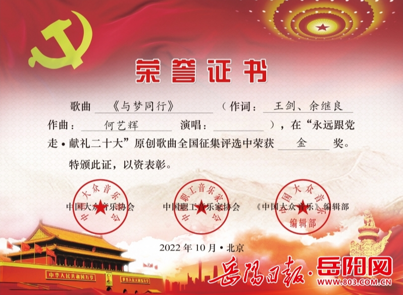 岳阳日报全媒体讯(记者 陈毅)近日, 由王剑、余继良作词,湖南省音乐家协会会员、中国民族管弦乐学会会员、青年作曲家何艺辉作曲,浙江佳音艺校教师演唱的歌曲《与梦同行》,在献礼党的二十大全国征歌评选活动中获得金奖。