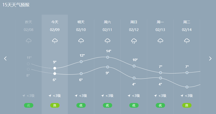 预计我县10~11日阴天有小到中雨;12~13日小雨;14日天气转好。气温略有起伏:9~13日最高气温14°C,最低气温4°C。