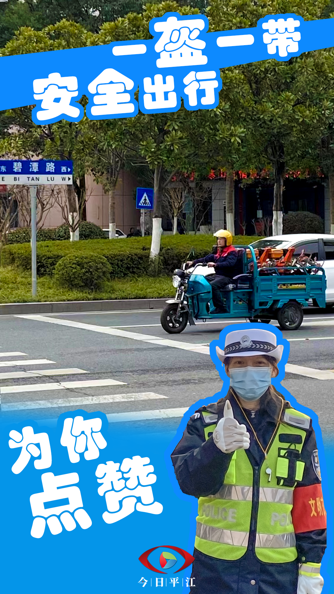 “道路千万条,安全第一条,正确佩戴头盔、规范使用安全带,能降低约65%的交通事故死亡风险,一盔一带、文明驾驶对自己和家人负责。”