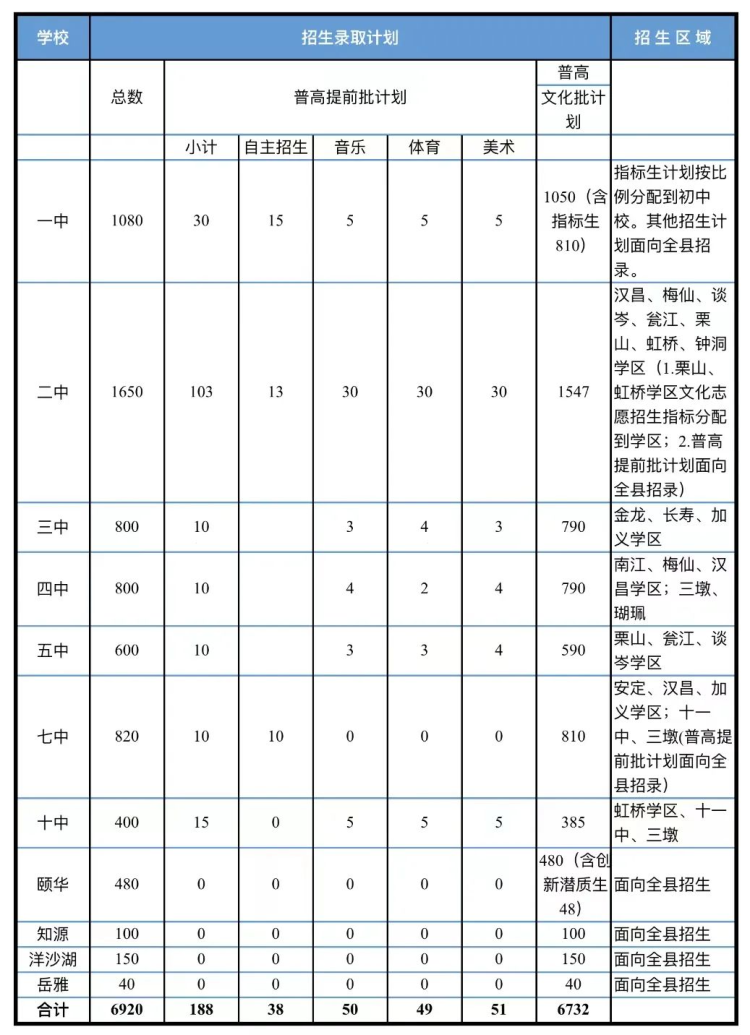 2023年全县高中学校招生计划12420人,其中普高招生计划6920人(详见下表),职高招生计划5500人。
