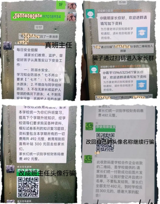 近日在伍市镇某小学的一个班级微信群中,“老师”突然发了一条收取 492元复习资料费的信息,并发了一个收款二维码,有的家长看到收费消息,随即将资料费转给了这名“老师”。谁知这名“老师”是骗子冒充的,伍市派出所接到报警时,已有5位家长被骗共计2460元,民警迅速开展调查,与班级老师取得联系,证实确实有人冒充老师进群实施诈骗。
