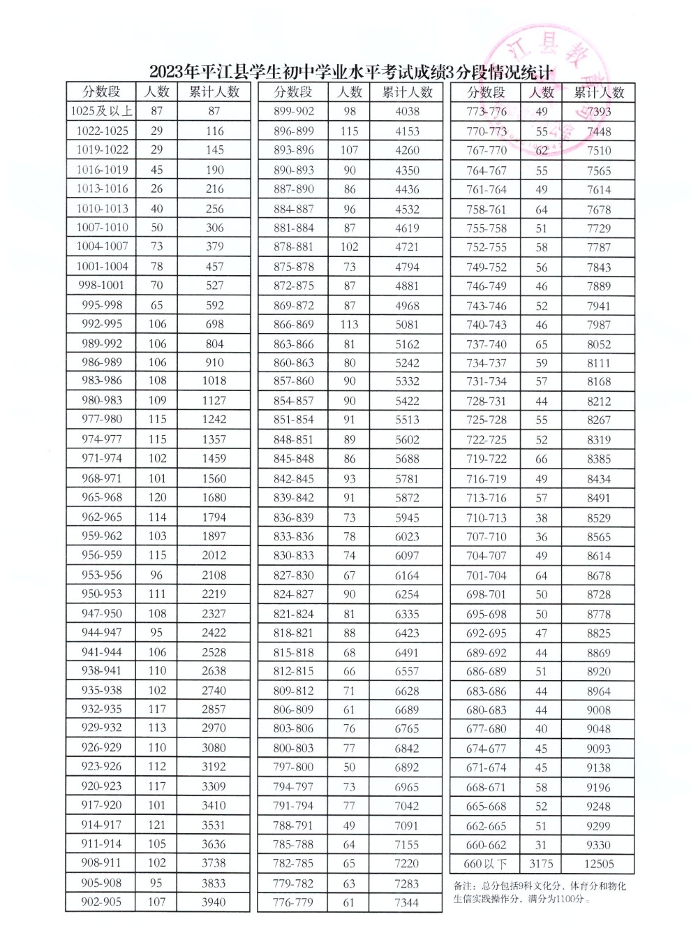 2023年平江县学生初中学业水平考试成绩3分段情况统计