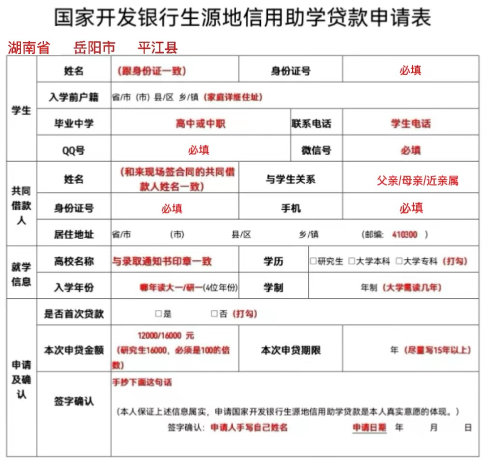 平江县教育局前栋1楼生源地助学贷款办理中心。(三阳乡平源村)