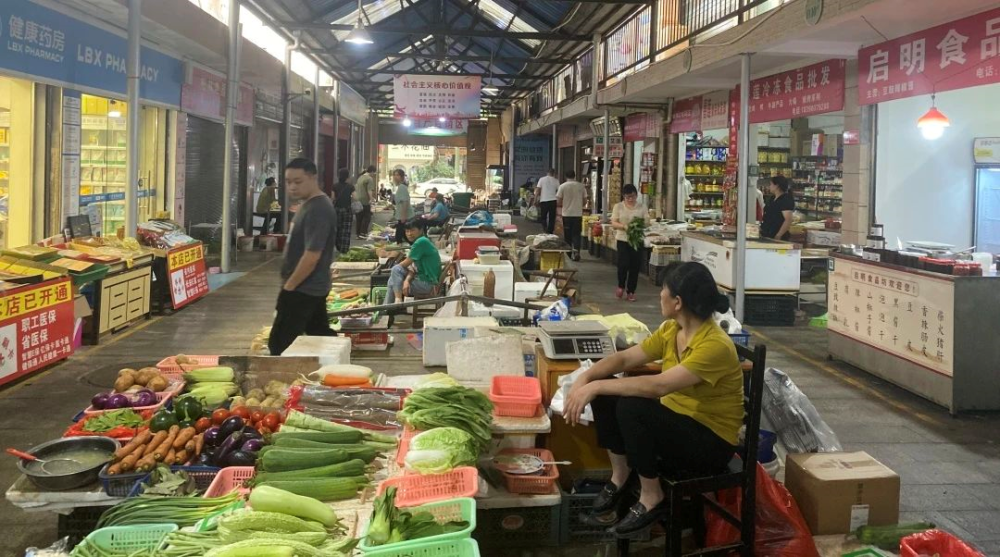 7月10日上午,记者来到商南街,只见这里人群熙熙攘攘,充满烟火气息,一个大棚横穿整条街道,大棚里面设置多个分类经营区,摊贩们有序经营,市民们也在有序选购。