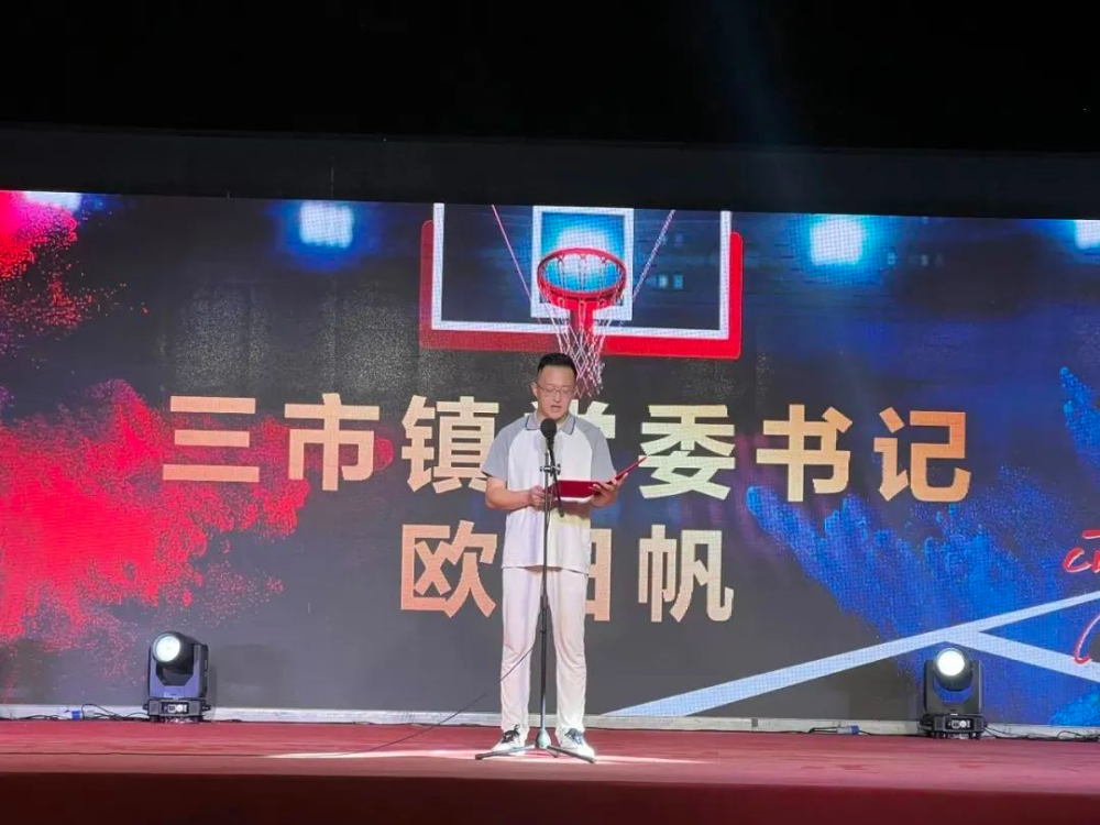 三市镇党委书记欧阳帆表示:值此全国第一个“体育宣传周”来临之际,三市镇隆重举行“三市商会杯”和美乡村(辣BA)篮球联赛·音乐节·美食节·招聘会。四个活动中篮球赛以公正二字,来保证热爱;招聘会以工作二字,来体现担当;展览会以共赢二字,来增进开放;演唱会以恭贺二字,来感谢时代。