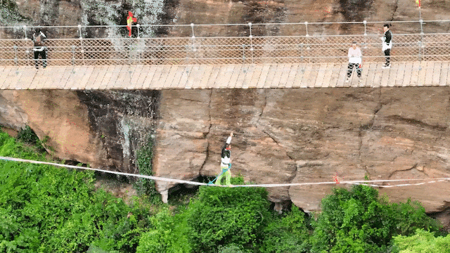 上午,与会领导和嘉宾来到坐落于丹霞山水之间的红莲兵寨,这里正在进行紧张刺激的2023年中法高空扁带国际友谊赛的决赛。世界纪录保持者、全国纪录保持者等中外参赛选手行走在近百米的高空扁带上,宛如空中曼舞,视觉冲击和旅游体验在此刻拉满,嘉宾、游客纷纷驻足观看,拍照留念。
