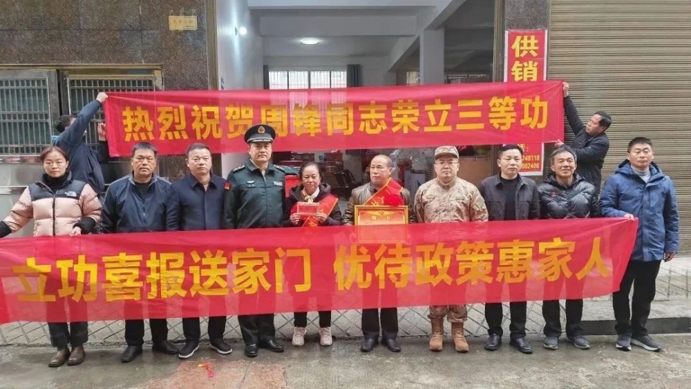 1月17日,县人武部、县退役军人事务局会同火箭军某部来到南江镇,为荣获“三等功”的现役军人周锋送来喜报和慰问金,一同到来的还有来自党和政府以及部队的关心关怀。周锋的母亲李如意激动地说:“孩子在部队荣立军功,我们全家都感到既欣慰又自豪。感谢部队培养和党委政府关心,我们将一如既往支持孩子,做他坚强的后盾,让他安心服役。”
