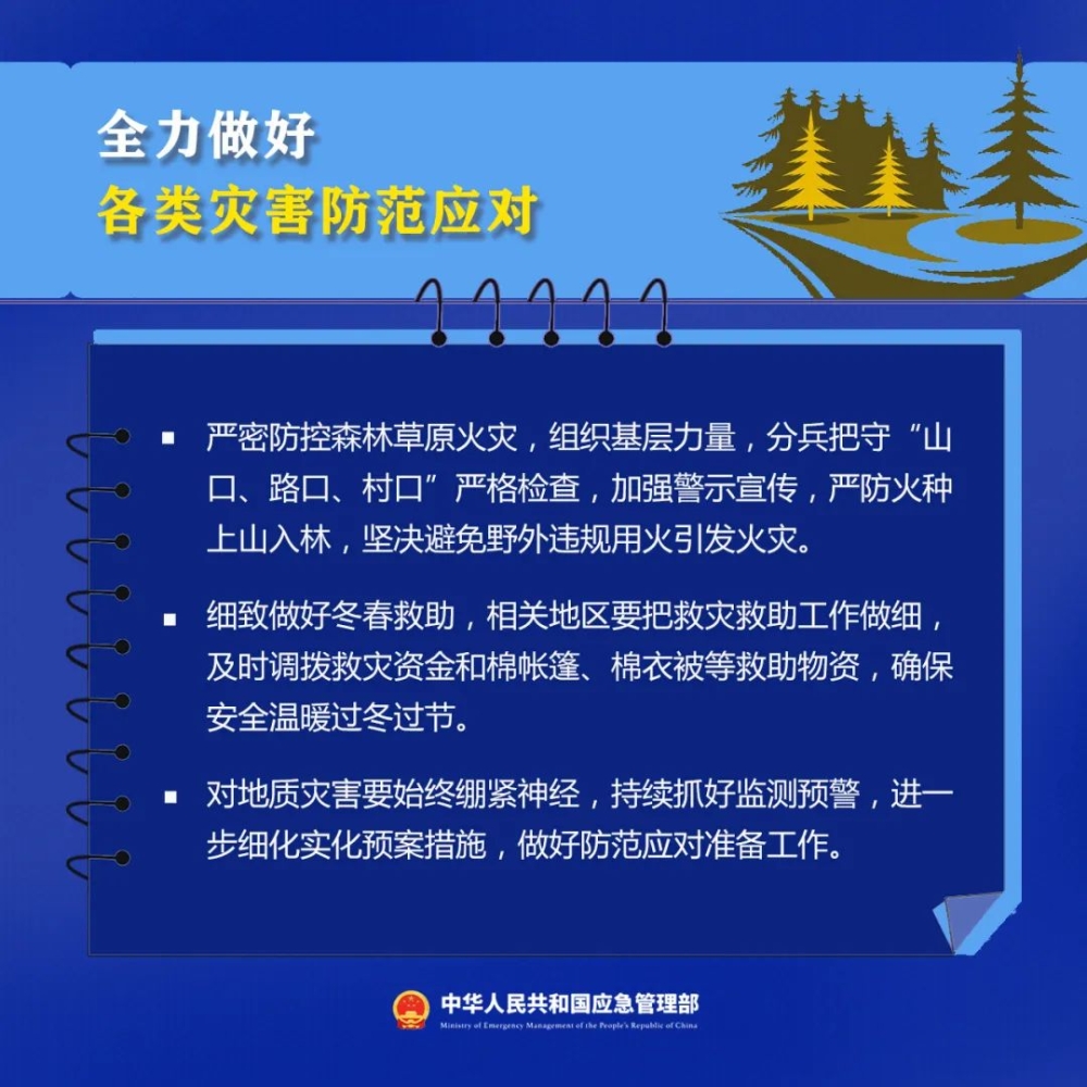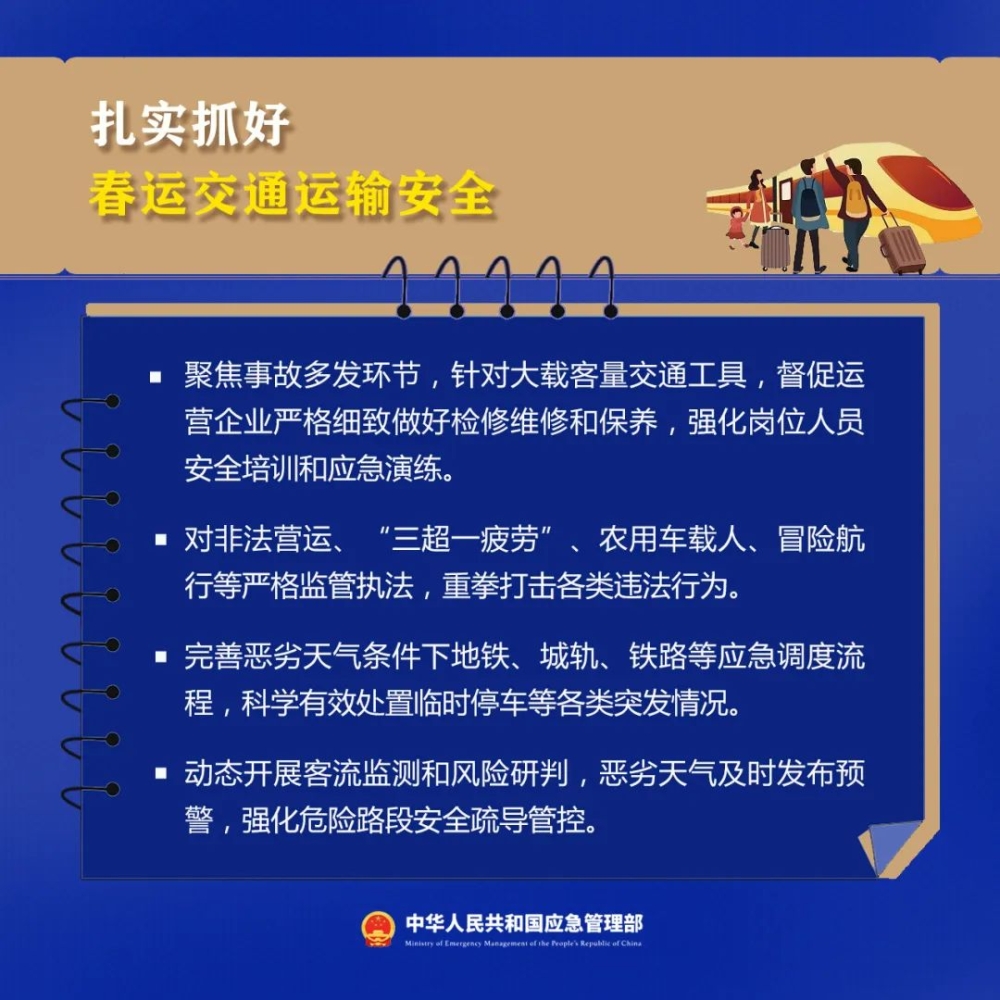 今年春节,群众出行出游意愿更加强烈,大型活动明显增多,交通运输、餐饮娱乐、宾馆住宿等迎来客流高峰,煤炭、石化等企业保供压力持续加大,低温雨雪冰冻等灾害多发,各类安全风险明显上升。如何抓好春节前后安全生产和防灾减灾救灾工作?这些重点事项一定要做到!