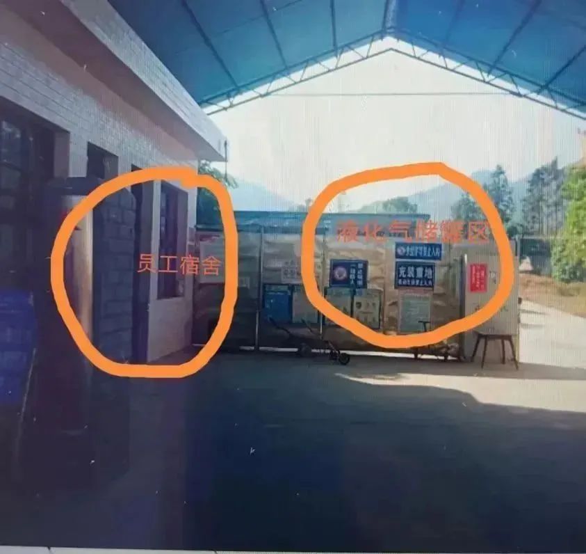 存在问题:该液化石油气储存、销售单位营业区的员工宿舍与液化气全压力式储罐的防火间距小于《液化石油气供应工程设计规范》(GB51142-2015)第5.2.8条规定值的75%,经营易燃易爆危险品场所未与居住场所保持安全距离,违反了《中华人民共和国消防法》第十九条第一款之规定。