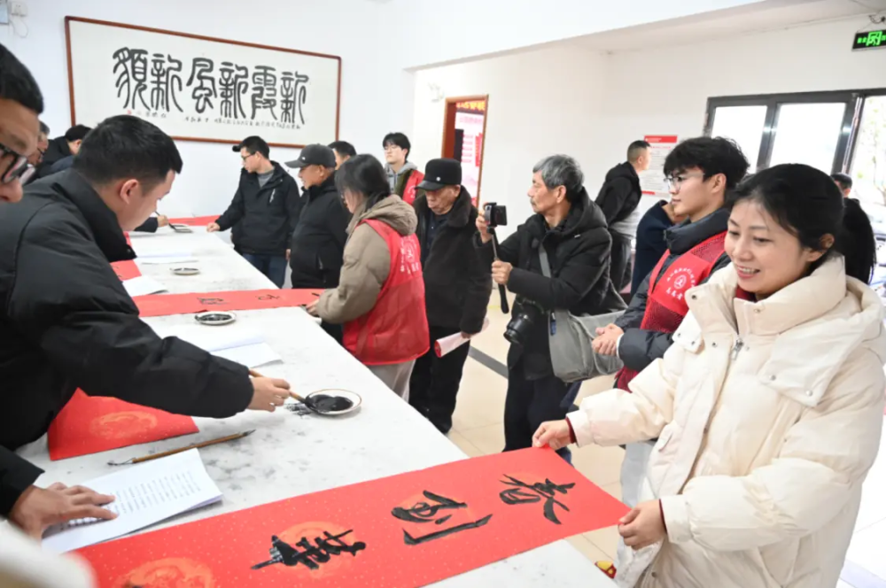 活动现场,手捧大红春联的邓女士脸上洋溢着幸福的微笑,开心地说:“往年家里贴的春联都是市场上买的,今年是书法家现场书写的,这样的惠民活动,倍受群众欢迎!”人群中,书法家、楹联家们个个挥毫泼墨,认真创作着一副副充满新年祝福的春联、一张张承载希望的“福”字,大红色的春联喜气洋洋,浓浓的年味浓缩于一笔一划之间,将新年祝福呈现在龙凤呈祥图案的春联上。200副红彤彤的春联和68个遒劲厚重的“福”字,大大增添了乡村过年的节日气氛,浓郁了人间烟火气。活动的开展,赢得了社会一致好评。