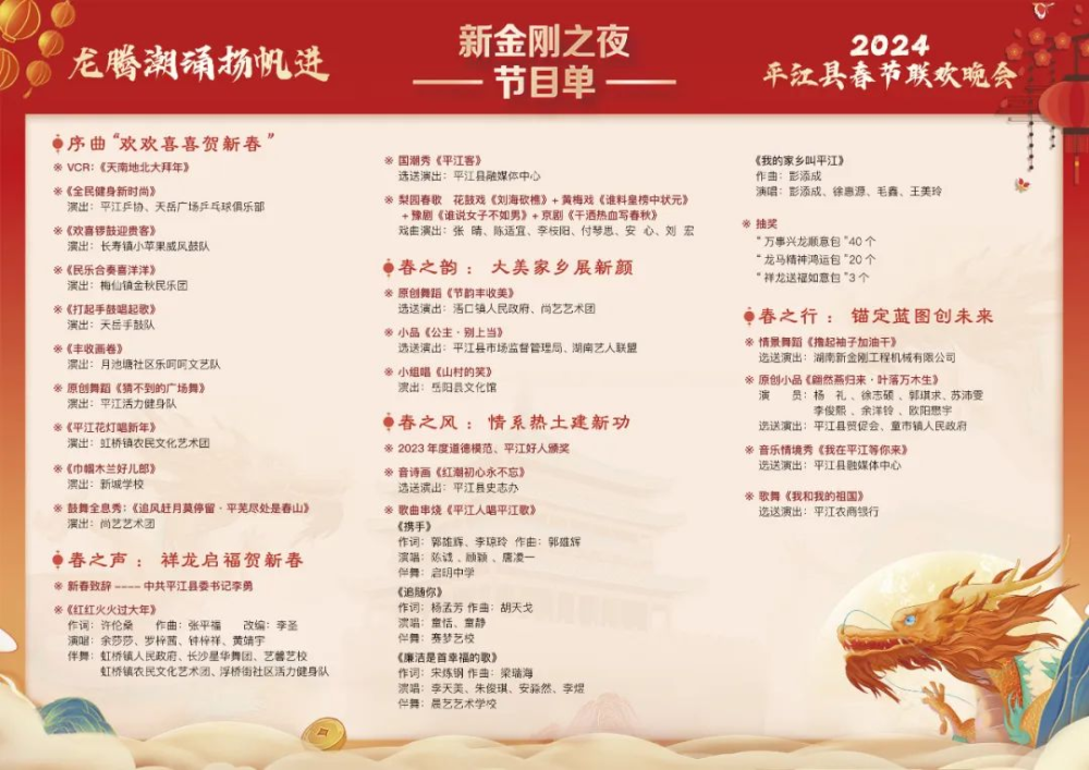 本次春晚由平江县委、县政府主办,县委宣传部、县文旅广体局 、县融媒体中心承办,湖南新金刚工程机械有限公司独家冠名。今晚(2月5日)7点,将在今日平江app、视频号、抖音号,平江广播电视台新闻频道同步直播。
