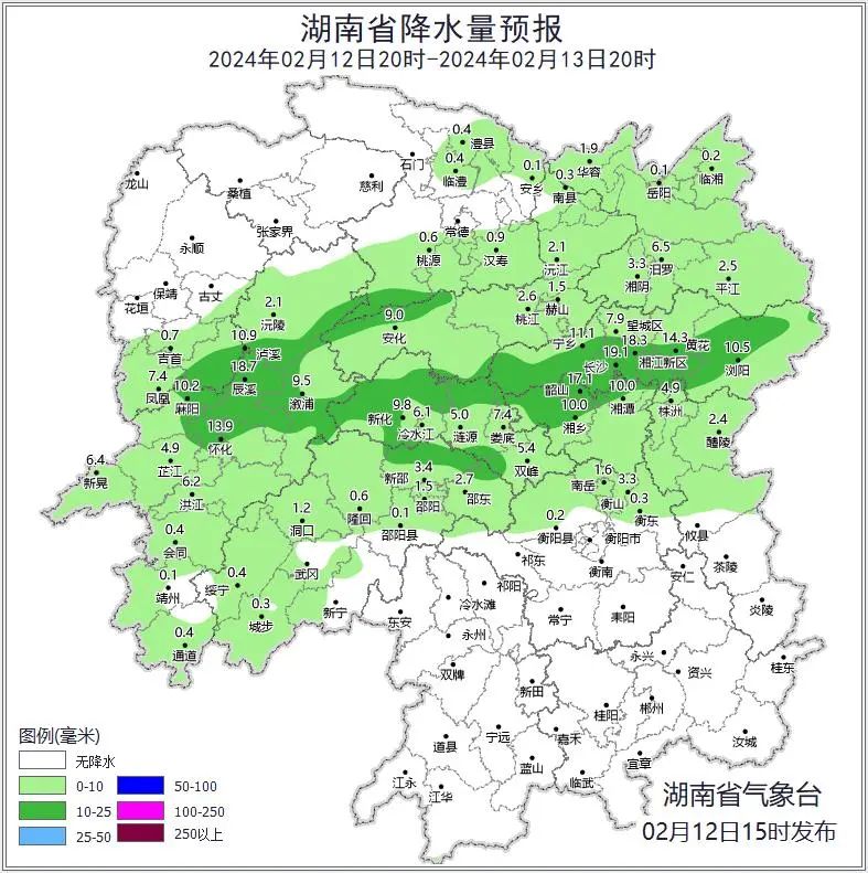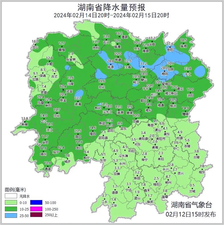 大年初三(12日)晚上至14日白天大部分地区有阵雨或雷阵雨,14日晚上至15日有一次降温降雨、风力加大天气过程,湘中及偏北部分中雨, 局地大雨。