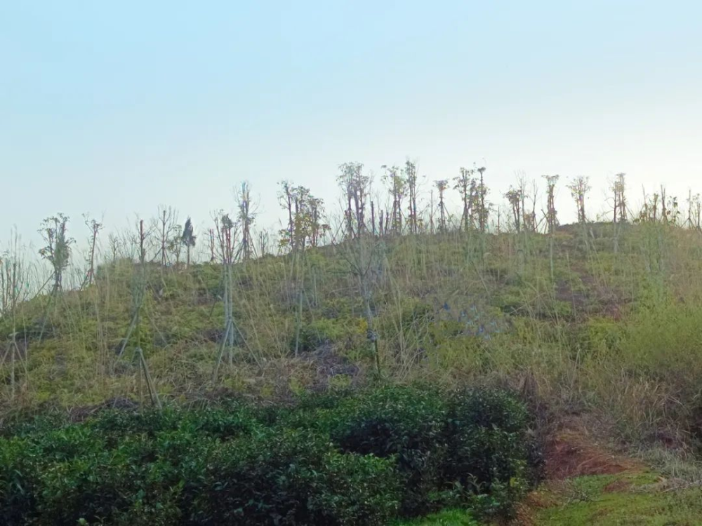2022年春天,县委书记李勇,县委副书记、县长彭方建等县四大家领导带队,来到三阳乡甲山村种下了500余株桂花、杜英树苗。现在树苗被养护人员用木桩以加固支撑,每棵树垂直生长,长势良好,跟附近的山林渐渐融为一体。
