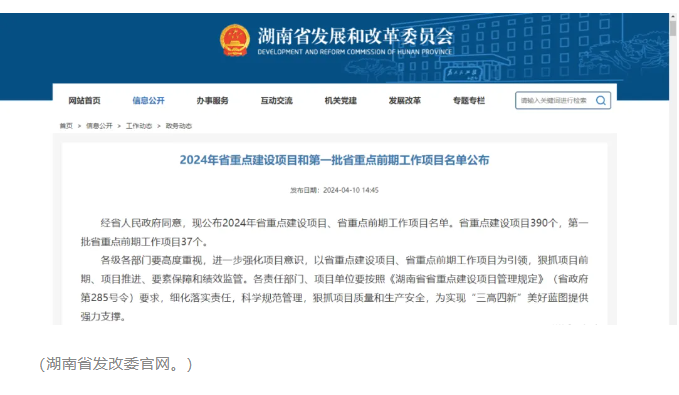 近日,湖南省发改委公布2024年省重点建设项目、省重点前期工作项目名单。今年,全省铺排省重点建设项目390个,总投资2.3万亿元,年度计划投资4715亿元。