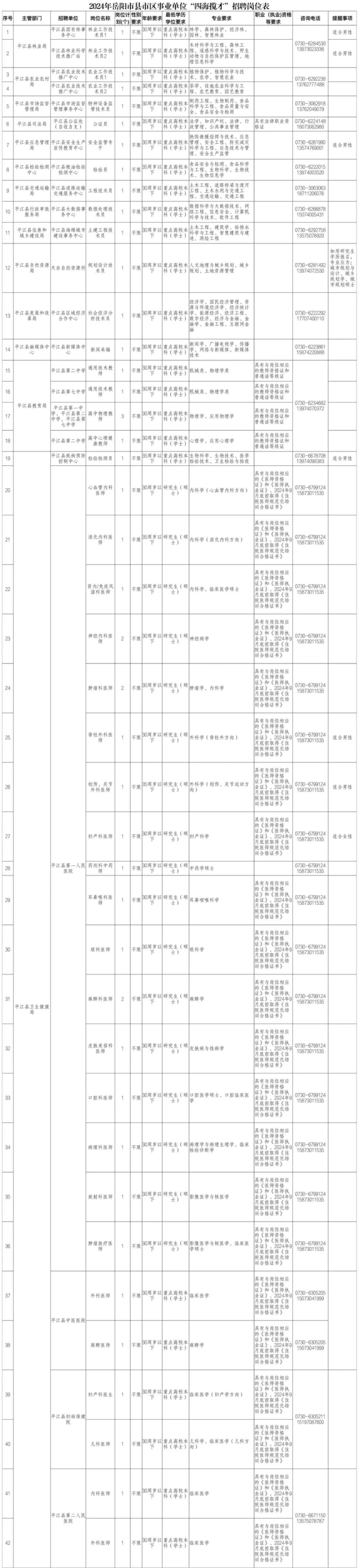 今天岳阳市人社局发布《2024年岳阳市事业单位“四海揽才” 招聘工作人员公告》,其中,平江县直事业单位招聘47人,来看看具体招聘岗位与要求。