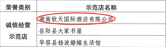 诚信经营示范店:湖南钦天国际酒店有限公司