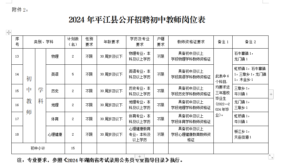 笔试时间、地点及要求另行公告(关注平江县政府门户网、平江县人力资源和社会保障局官网、平江县教育局官网公示公告栏)。