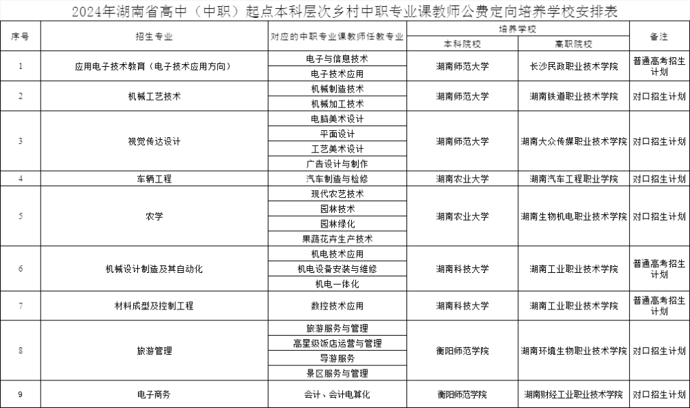 根据省教育厅《关于征集2024年湖南省公费定向师范生培养招生需求计划的通知》要求,以及各市州申报的2024年乡村教师公费定向培养招生需求计划,在综合平衡的基础上,省教育厅编制了高中起点各类乡村教师公费定向培养招生计划。