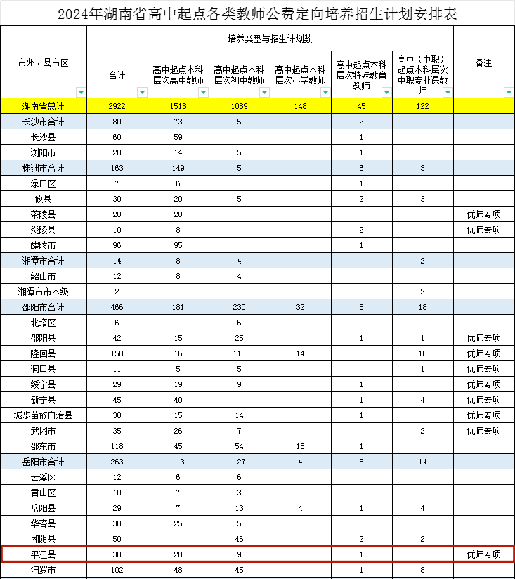 2024年全省高中(中职)起点本科层次各类乡村教师公费定向培养招生计划为2922人,其中平江30人。