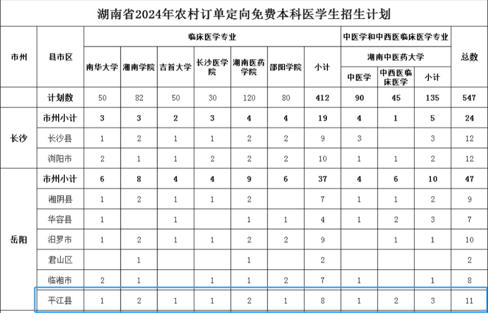 ▲湖南省2024年农村订单定向免费本科医学生招生计划(部分)