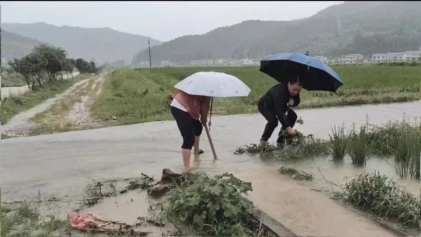 上午10点左右,芦溪村党总支书记李健康正带队巡查,发现路边一块田地已经被淹没了,检查后发现排水沟被堵塞了。暴雨之下,他们挽起裤脚就开始通沟,半小时后,田地里的水终于顺利排出。