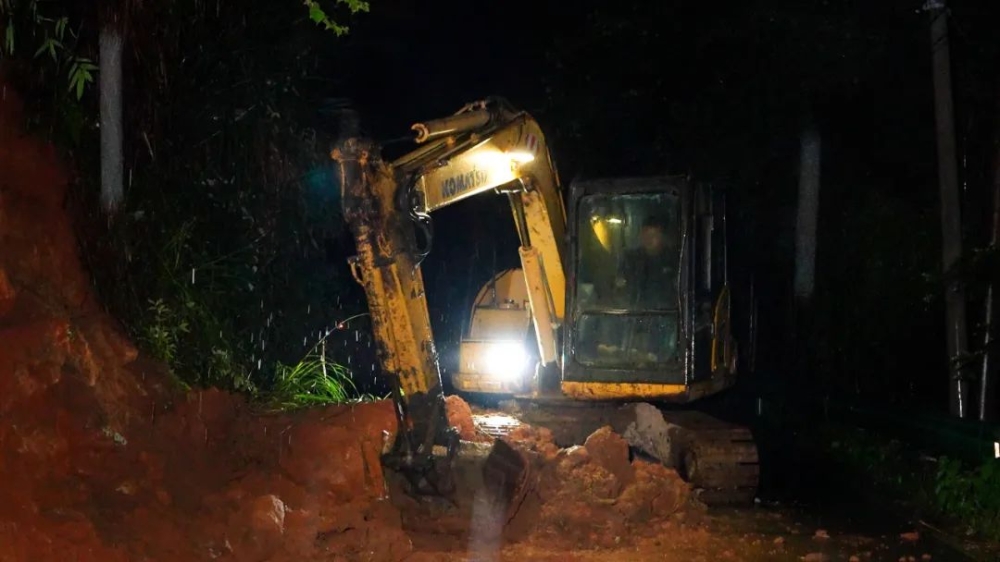 晚上8点,尚山村一处道路被落石堵塞,支部书记黄忠田得知情况后,第一时间调度来1辆挖掘机进行夜间作业。