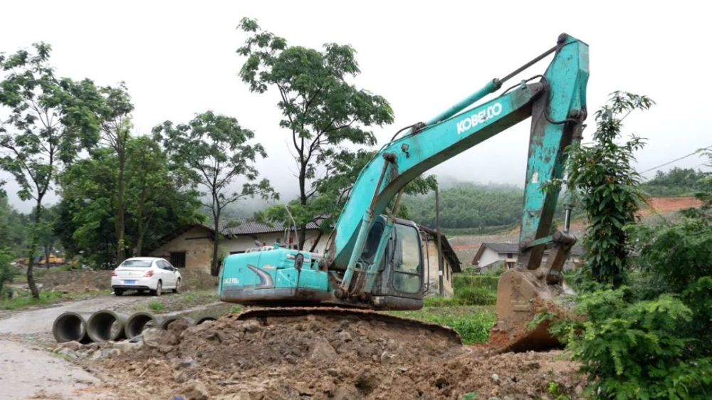 记者在现场看到,大概离房屋2米远的位置有着明显被洪水冲刷过的痕迹。挖掘机已经把路面断开,准备把水管埋进去,将水导回河道。