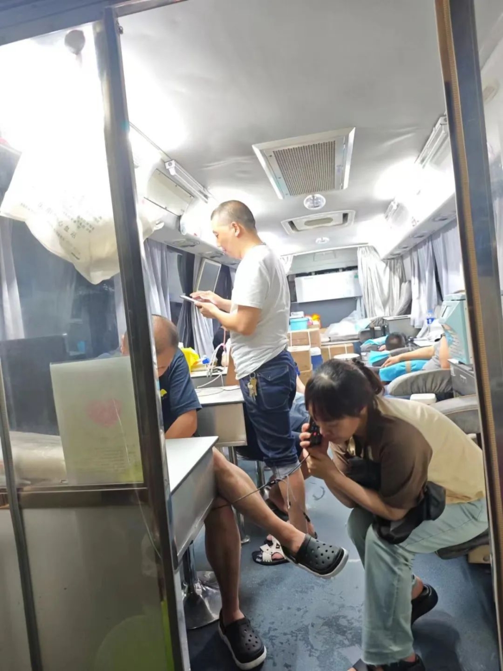 到了晚上,部分受灾群众因无家可归,献血车又秒变“避难所”,成为他们临时住地,一晃十几个小时过去了,彭海斌和护士们才想起一天还没吃饭。