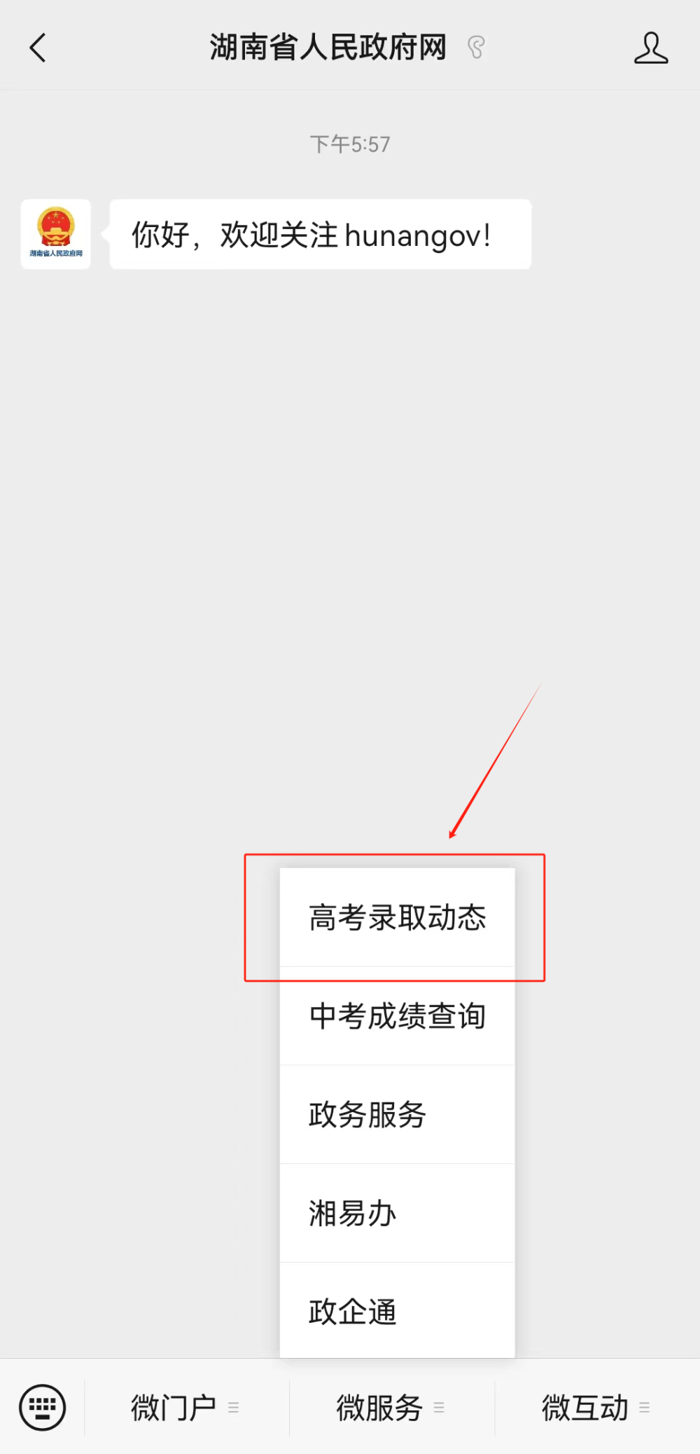 “湖南省人民政府网”微信公众号查询方式: