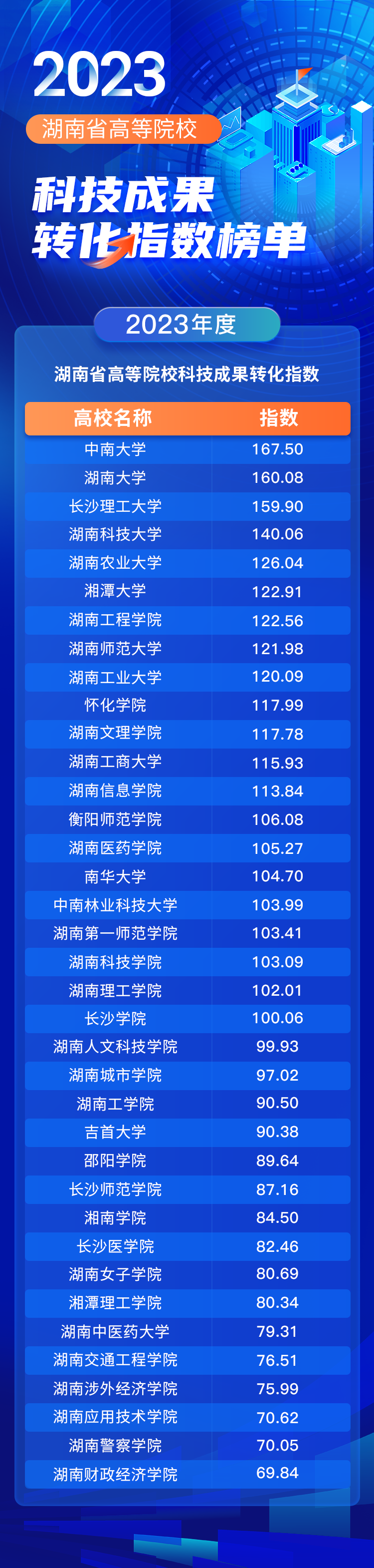 今天,2023年湖南省高等院校科技成果转化指数正式公布,根据指数得分结果,中南大学、湖南大学、长沙理工大学、湖南科技大学、湖南农业大学、湘潭大学、湖南工程学院、湖南师范大学、湖南工业大学、怀化学院进入全省前10名。