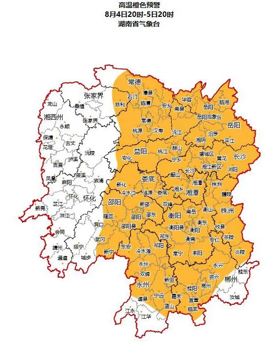 湖南省气象台8月4日16时发布高温橙色预警:预计4日20时至5日20时,长沙、株洲、湘潭、衡阳、邵阳、岳阳、常德、张家界东北部、益阳、郴州、永州、娄底将达到37℃以上高温,局部地区将达到39℃以上,请做好防范。这是省气象台8月份发布的首个高温橙色预警。