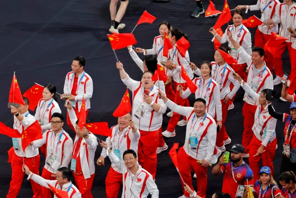 闭幕式上,各代表团运动员代表依次入场,举重奥运冠军李发彬和女子曲棍球队队长欧紫霞作为中国体育代表团旗手,高举五星红旗出场。