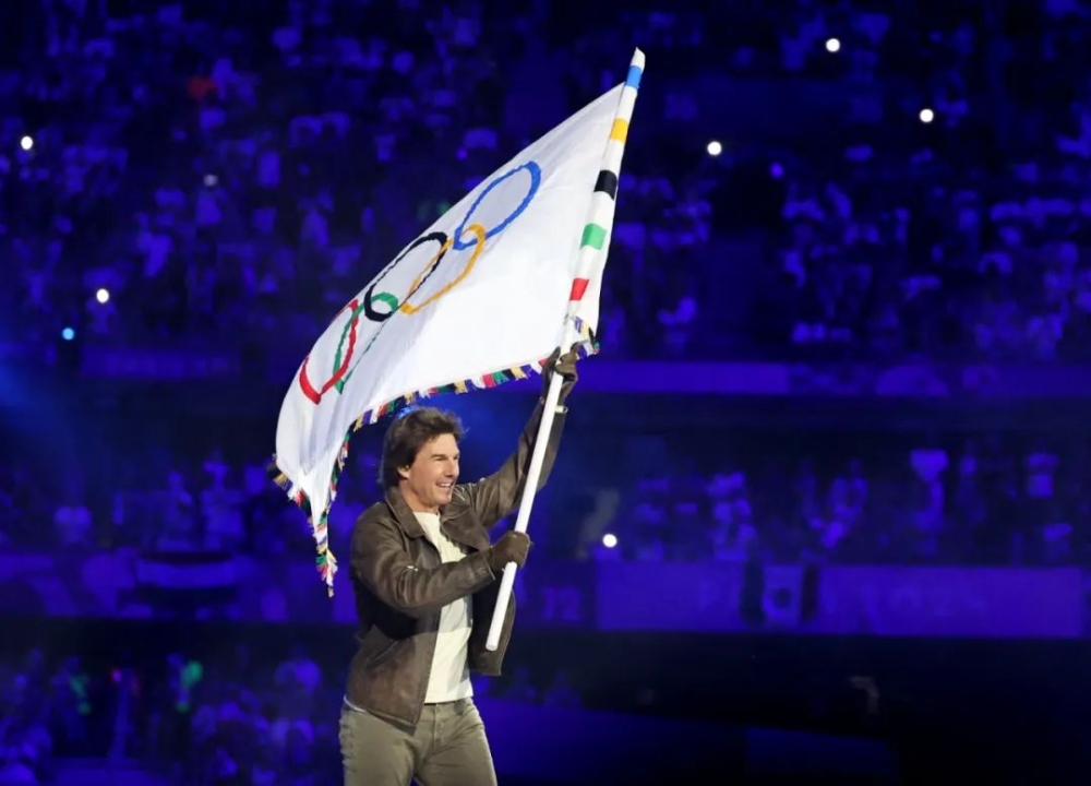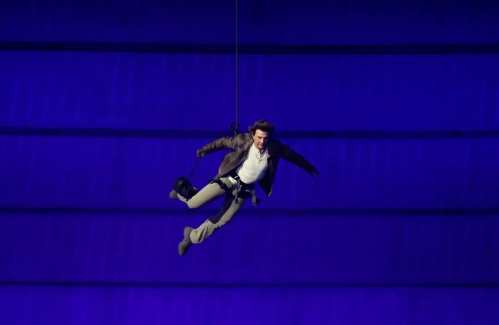 好莱坞明星汤姆·克鲁斯,从法兰西体育场的顶端,以惊心动魄的绳索速降方式登场,稳稳落在体育场中央,接过象征荣耀的奥运旗帜,随后在他的带领下,五环旗从巴黎“飘扬”到洛杉矶。