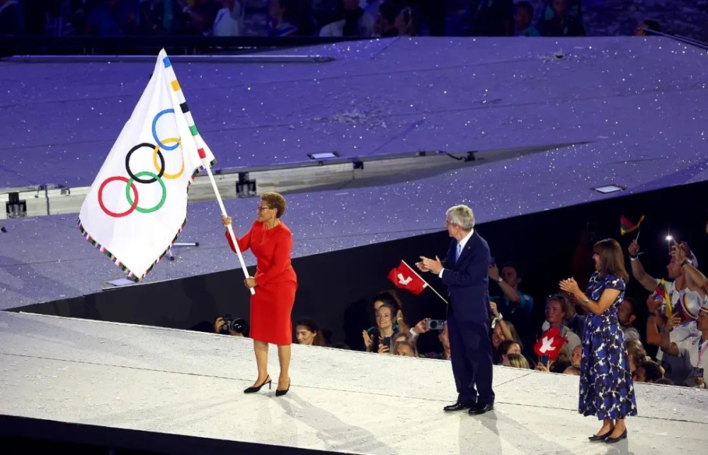 随着美国洛杉矶市市长,从国际奥委会主席巴赫手中接过奥林匹克会旗,巴黎时间结束,夏季奥运会正式进入洛杉矶时间。