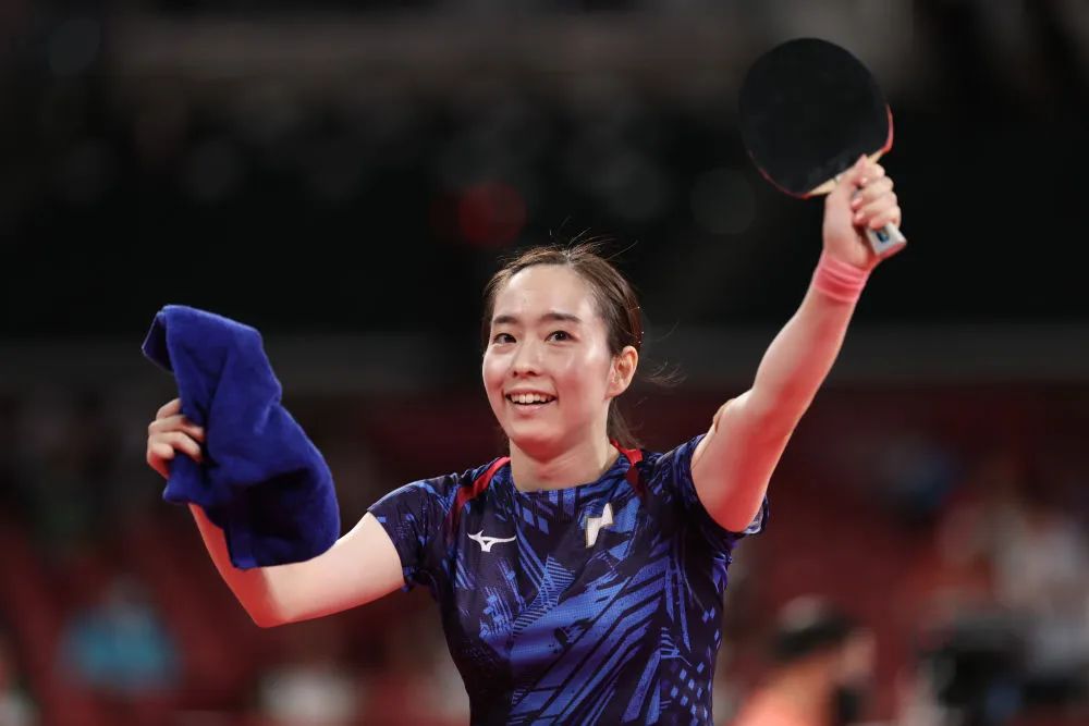 2021年7月26日,在东京奥运会乒乓球女子单打第三轮比赛中,石川佳纯战胜泰国选手奥拉万后庆祝胜利。图源:新华社